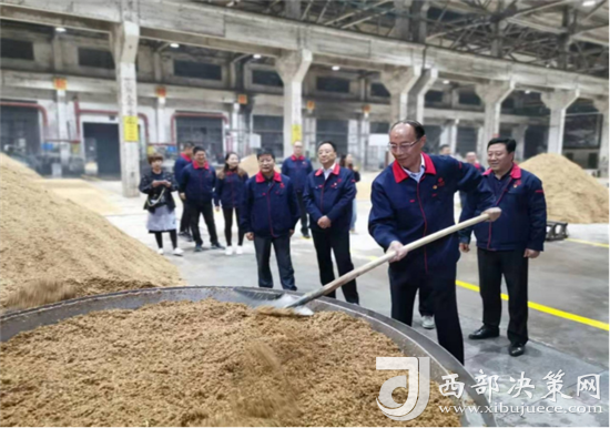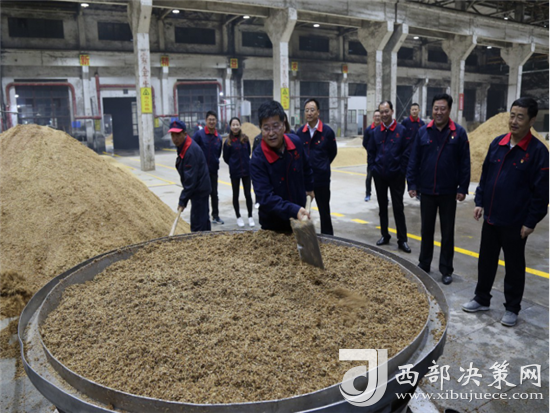 西鳳集團(tuán)公司領(lǐng)導(dǎo)班子成員還詳細(xì)查看了窖池發(fā)酵情況,現(xiàn)場和工人師傅們一起裝甑餾酒,為大家鼓勁加油!