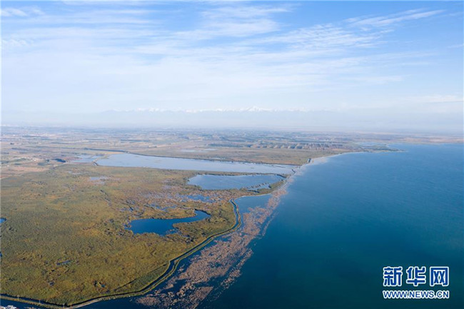 這是新疆博斯騰湖美景(10月12日無(wú)人機(jī)拍攝)。入秋以來(lái),新疆博斯騰湖碧波蕩漾,美景如畫,吸引各地游客前來(lái)游玩。新華社記者丁磊攝