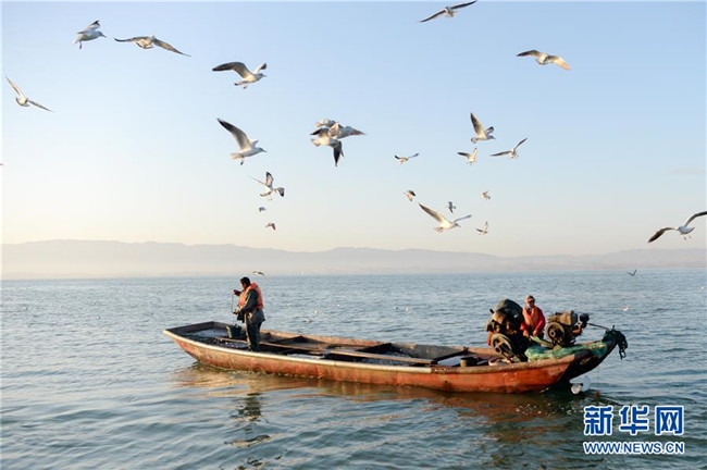 新疆博湖縣的漁民在博斯騰湖捕魚(10月12日攝)。入秋以來(lái),新疆博斯騰湖碧波蕩漾,美景如畫,吸引各地游客前來(lái)游玩。新華社記者丁磊攝