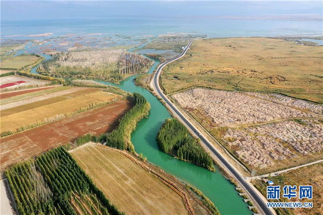 這是新疆博斯騰湖河堤公路(10月12日無(wú)人機(jī)拍攝)。入秋以來(lái),新疆博斯騰湖碧波蕩漾,美景如畫,吸引各地游客前來(lái)游玩。新華社記者丁磊攝