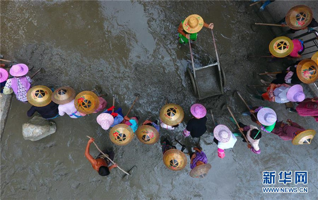 在黔桂烏英苗寨,群眾在修河堤(7月3日無(wú)人機(jī)拍攝)。
