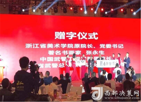 浙江省美術學院原院長、黨委書記、著名書畫家——張永生,浙江省武警總隊原總隊長何虎少將現(xiàn)場贈字,西鳳股份公司副董事長、總經(jīng)理賈智勇上臺接受贈字。
