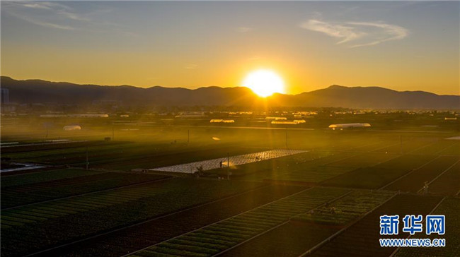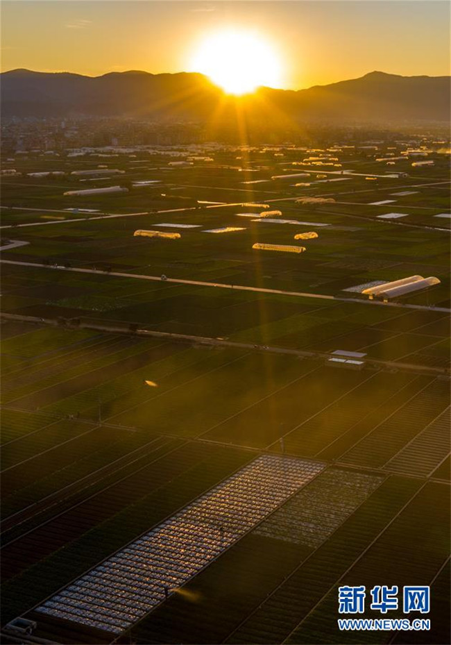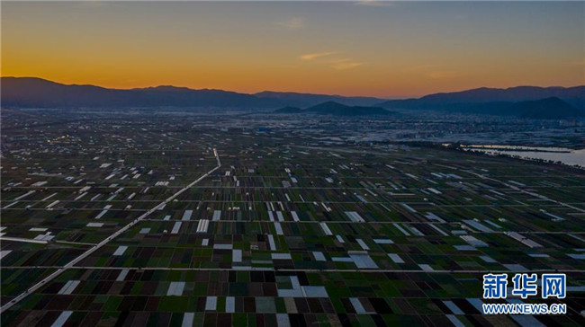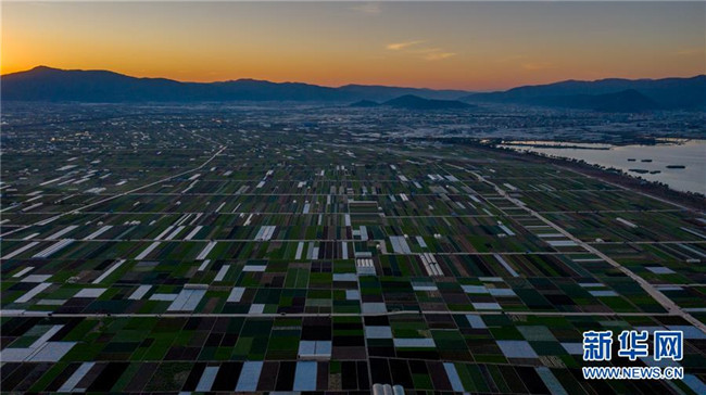 這是云南省玉溪市通??h的田園風光(11月23日無人機拍攝)。初冬時節(jié),云南省玉溪市通海縣風景秀麗,山巒、湖水與農田組成了一幅美麗的田園詩畫卷。新華社記者胡超攝