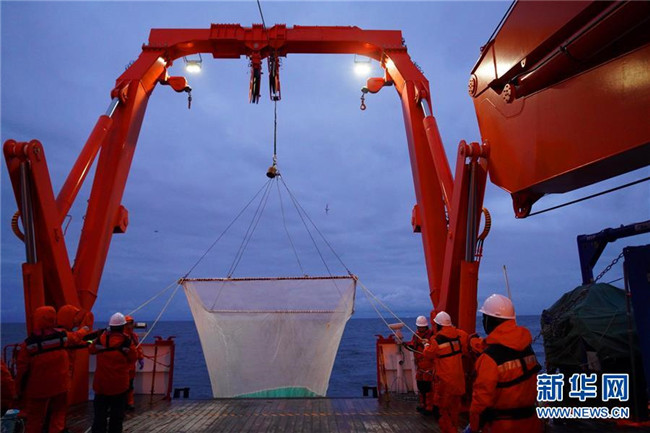 “雪龍2”號12月7日離開南大洋普里茲灣海域向西航行,開始對宇航員海海域展開科考作業(yè)??瓶缄爢T沿著本次宇航員??瓶嫉氖讉€調查斷面,自北向南做了多個站位的CTD(海水溫鹽深測量儀)采水作業(yè)、浮游生物垂直拖網(wǎng)作業(yè),以及魚類拖網(wǎng)和箱式采樣器等采樣作業(yè)。