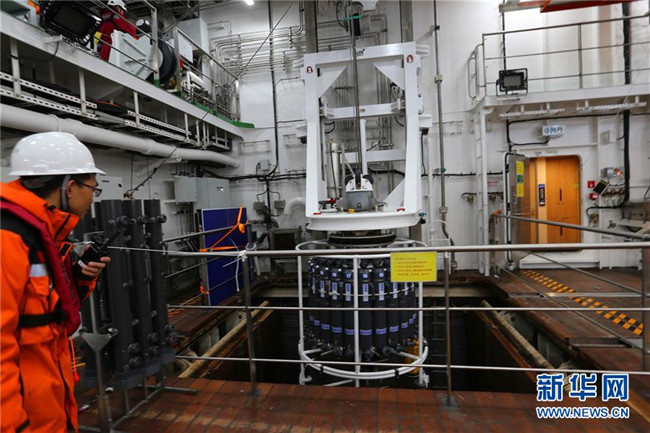 12月9日,科考隊員首次利用“雪龍2”號月池系統(tǒng)進行CTD采水作業(yè)。 新華社記者 劉詩平 攝