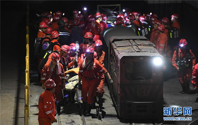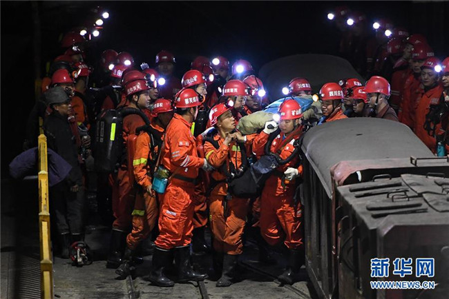 12月18日,救援人員轉(zhuǎn)運(yùn)安全升井的被困人員。新華社記者 薛玉斌 攝