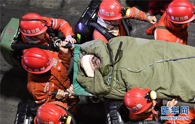 12月18日,救援人員轉(zhuǎn)運(yùn)安全升井的被困人員。 當(dāng)日7時56分,經(jīng)過80多個小時的緊張救援,發(fā)生透水事故的川煤集團(tuán)杉木樹煤礦13名被困人員全部安全升井。 新華社記者 薛玉斌 攝