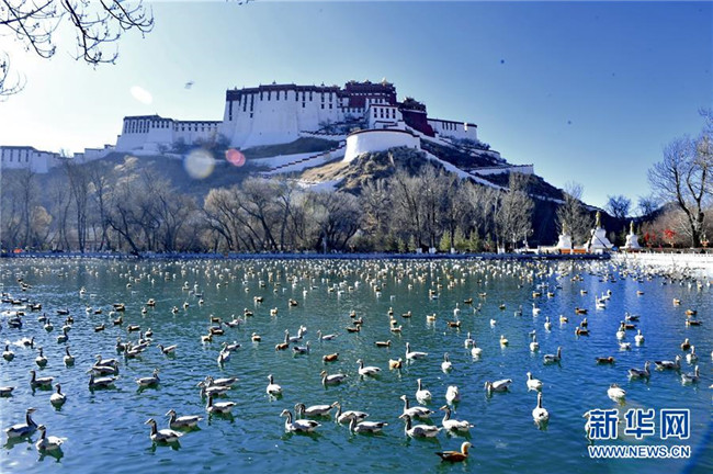 冬日,西藏拉薩市布達(dá)拉宮腳下的龍王潭公園成了鳥(niǎo)的“天堂”。數(shù)不盡的斑頭雁、赤麻鴨、紅嘴鷗在這里嬉戲、覓食。