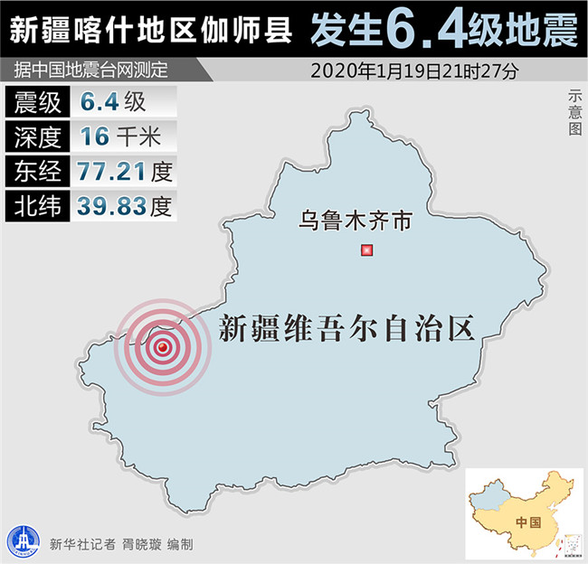 據(jù)中國地震臺網(wǎng)正式測定,19日21時27分在新疆喀什地區(qū)伽師縣發(fā)生6.4級地震,震源深度16千米,震中位于北緯39.83度,東經(jīng)77.21度。