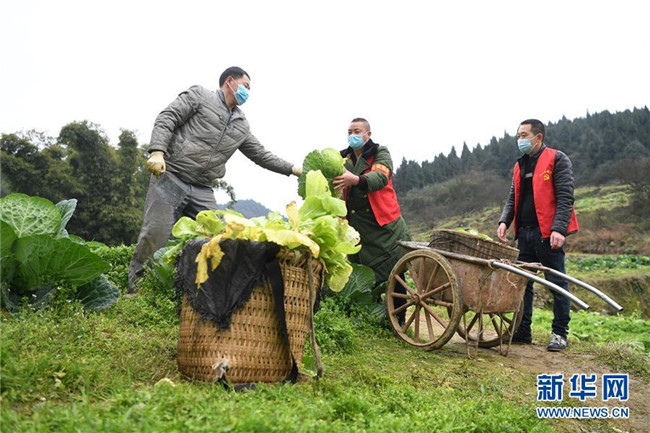 2月8日,菜農(nóng)(左)和鄉(xiāng)村蔬菜配送小隊志愿者在搬運(yùn)蔬菜。 新華社記者 唐奕 攝