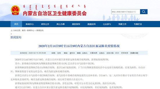 2月15日,記者從內(nèi)蒙古自治區(qū)衛(wèi)生健康委員會(huì)獲悉,2020年2月14日9時(shí)至15日9時(shí),內(nèi)蒙古自治區(qū)報(bào)告新增新冠肺炎確診病例3例。新增疑似病例7例。