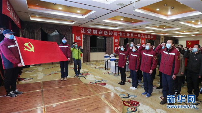 在湖北省咸寧市,云南省援助湖北省醫(yī)療隊臨時黨委組織疫情防控一線第一批發(fā)展黨員進行入黨宣誓儀式(2月26日攝)。 新華社發(fā)(楊崢 攝)