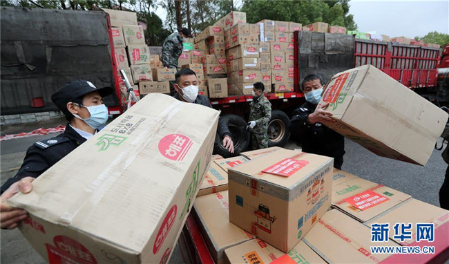一批云南捐贈的食品和醫(yī)療用品等物資運抵咸寧市(2月28日攝)。新華社發(fā)(楊崢 攝)