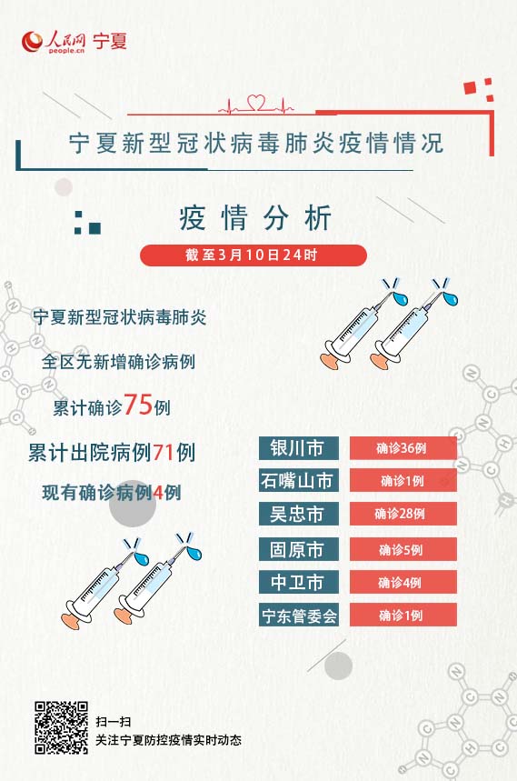 截至3月10日24時(shí),全區(qū)現(xiàn)有確診病例4例,累計(jì)出院病例71例。全區(qū)累計(jì)報(bào)告確診病例75例,其中銀川市36例,石嘴山市1例,吳忠市28例,固原市5例,中衛(wèi)市4例,寧東1例。全區(qū)無疑似病例。
