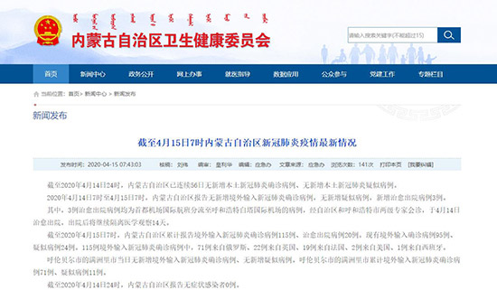 2020年4月14日7時(shí)至4月15日7時(shí),內(nèi)蒙古自治區(qū)報(bào)告無新增境外輸入新冠肺炎確診病例,無新增疑似病例,新增治愈出院病例3例。