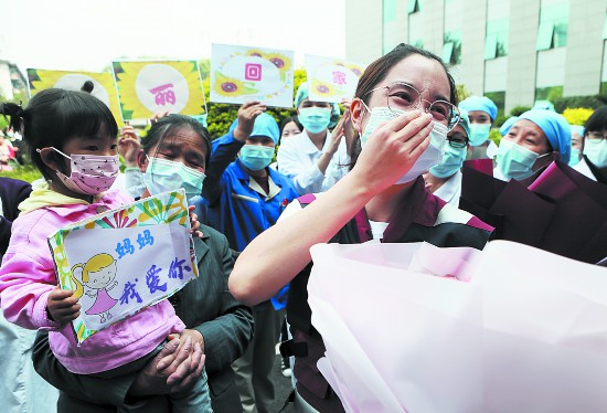 “看到你們平安回來,我們就放心了!”下午2點40分左右,當隊員們走下大巴車時,早已等候在此的醫(yī)院領(lǐng)導、職工和家屬紛紛迎上前去,為他們獻上鮮花和擁抱。在第一住院大樓前,醫(yī)院舉行了簡單而隆重的歡迎儀式,隊長張文婷匯報了醫(yī)療隊工作情況,面對大伙的熱情迎接,她激動得流下眼淚,幾度哽咽:“雖然前方工作辛苦,但能圓滿完成黨和國家交付的任務(wù),我們都覺得十分驕傲!”儀式現(xiàn)場,一面寫著“逆行抗疫 大愛無疆”的錦旗引人注目,這是武漢大學人民醫(yī)院東區(qū)五病區(qū)一名患者為感謝省醫(yī)院醫(yī)護人員,專門從武漢寄到成都來的,短短八個字,卻飽含感恩和敬意。