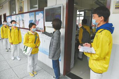 成都高新實(shí)驗(yàn)中學(xué)高三學(xué)生排隊(duì)測量體溫進(jìn)入教室。