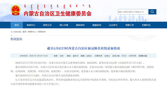 據(jù)內(nèi)蒙古自治區(qū)衛(wèi)生健康委員會5月8日發(fā)布的消息,2020年5月7日7時至5月8日7時,內(nèi)蒙古自治區(qū)報告無新增確診病例、疑似病例。新增治愈出院1例(由滿洲里市口岸入境)。