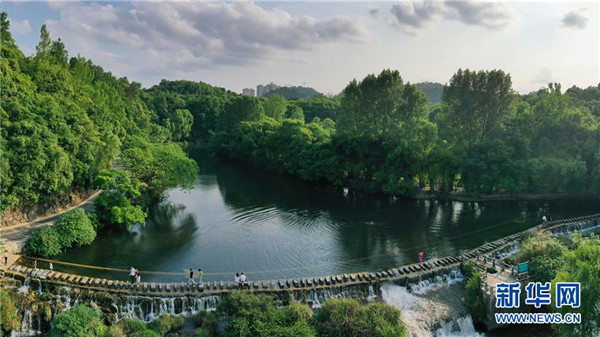 5月19日,游客在貴陽市花溪國家城市濕地公園黃金大道游玩。近日,貴州省貴陽市花溪國家城市濕地公園黃金大道綠意盎然,美景如畫。新華社記者歐東衢攝