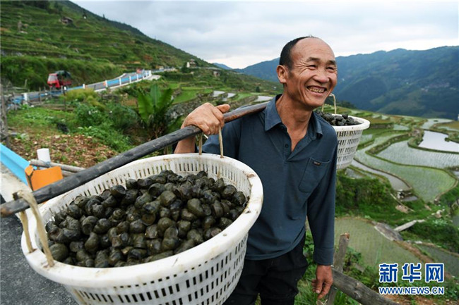 在田螺養(yǎng)殖過程中,采取“公司+合作社+農(nóng)戶”的模式,政府統(tǒng)一向龍頭公司采購種螺交給合作社,合作社根據(jù)貧困戶水田規(guī)模和意愿發(fā)放種螺,同時公司技術(shù)人員入村開展養(yǎng)殖技術(shù)培訓(xùn),田螺收獲時再由合作社對接種螺公司統(tǒng)一上門按保底價回收,解除了貧困戶養(yǎng)殖和銷售的后顧之憂,進(jìn)一步拓寬山區(qū)群眾脫貧增收渠道。 新華社記者 楊文斌 攝