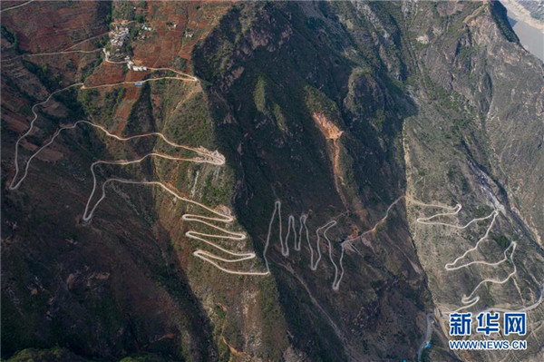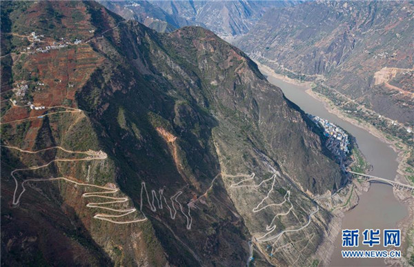 金陽縣蘆稿鎮(zhèn)大灣子村12公里左右的通村公路,28個彎蜿蜒盤旋在金沙江峽谷懸崖絕壁邊(6月7日攝,無人機照片)。坐落在金沙江畔的四川省金陽縣是國家級深度貧困縣,境內(nèi)群山連綿起伏,海拔落差大,眾多村寨處于高山或者高半山上,道路施工難度大。近年來,當?shù)卣畬⒔煌ㄗ鳛槊撠毠缘南葘怨こ?,路越修越寬、越修越好,成為當?shù)厝罕姷拿撠氈赂宦?。截?019年底,金陽縣實現(xiàn)所有鄉(xiāng)鎮(zhèn)通油路、建制村通硬化路,鄉(xiāng)道里程達329.9公里,村道里程達866.8公里。新華社記者江宏景攝