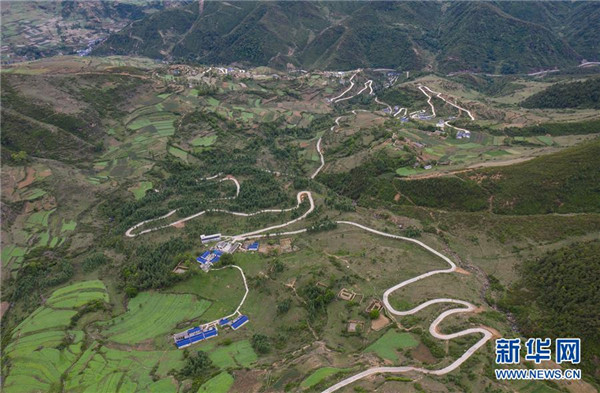 金陽縣天地壩鎮(zhèn)通往吉史里口村易地扶貧搬遷集中安置點的道路(6月7日攝,無人機照片)。坐落在金沙江畔的四川省金陽縣是國家級深度貧困縣,境內(nèi)群山連綿起伏,海拔落差大,眾多村寨處于高山或者高半山上,道路施工難度大。近年來,當?shù)卣畬⒔煌ㄗ鳛槊撠毠缘南葘怨こ?,路越修越寬、越修越好,成為當?shù)厝罕姷拿撠氈赂宦?。截?019年底,金陽縣實現(xiàn)所有鄉(xiāng)鎮(zhèn)通油路、建制村通硬化路,鄉(xiāng)道里程達329.9公里,村道里程達866.8公里。新華社記者江宏景攝