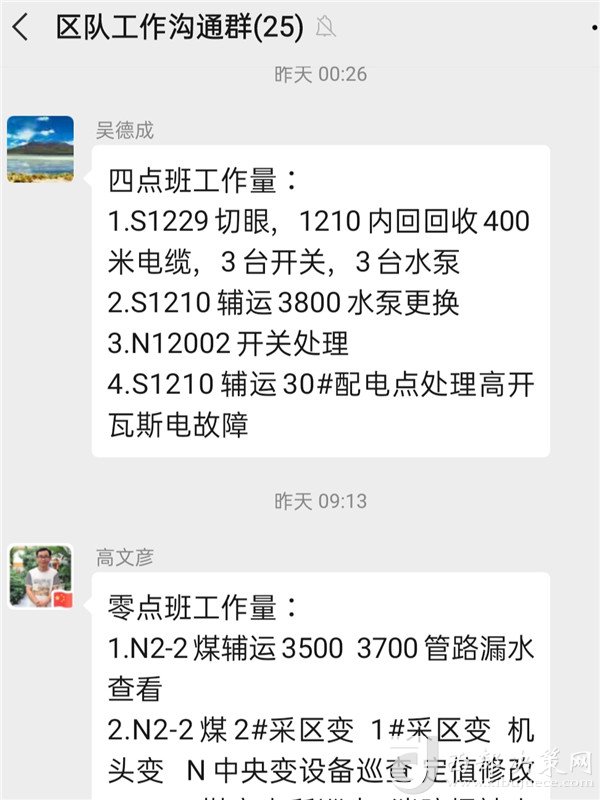 “南翼1210回風(fēng)巷回收400米低壓電纜”“南翼1210輔運(yùn)3800米處更換水泵一臺(tái)”......凌晨十二點(diǎn)半,剛下晚班的跟班副區(qū)長(zhǎng)吳德成便用手機(jī)編輯信息,將當(dāng)班任務(wù)完成情況匯報(bào)至區(qū)隊(duì)工作微信群。