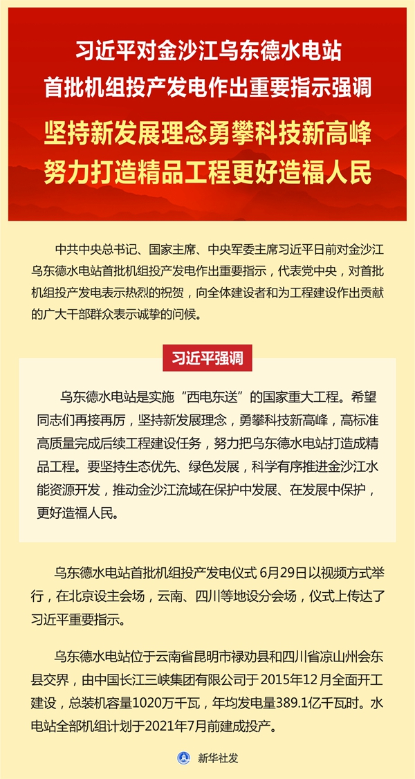 習近平強調,烏東德水電站是實施“西電東送”的國家重大工程。希望同志們再接再厲,堅持新發(fā)展理念,勇攀科技新高峰,高標準高質量完成后續(xù)工程建設任務,努力把烏東德水電站打造成精品工程。要堅持生態(tài)優(yōu)先、綠色發(fā)展,科學有序推進金沙江水能資源開發(fā),推動金沙江流域在保護中發(fā)展、在發(fā)展中保護,更好造福人民。