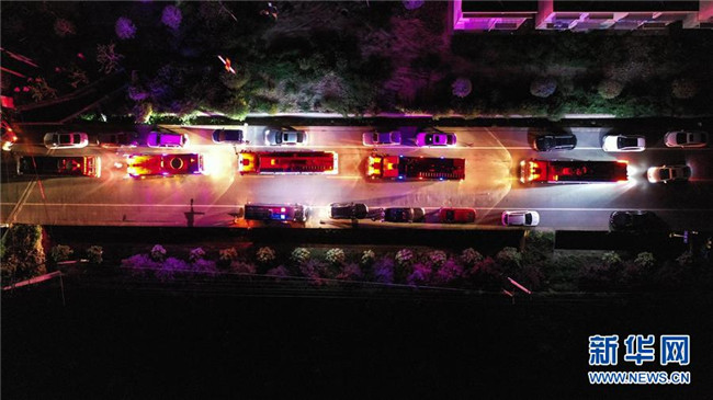 7月9日凌晨,在四川省廣漢市南豐鎮(zhèn)元盛村,消防車(chē)輛集結(jié)待命(無(wú)人機(jī)照片)。 7月8日晚,四川省廣漢市南豐鎮(zhèn)元盛村一花炮廠發(fā)生火災(zāi)并引發(fā)的爆炸事故,已導(dǎo)致6人受傷,其中2人重傷,4人輕傷。事故原因正在調(diào)查中。 新華社記者 王曦 攝