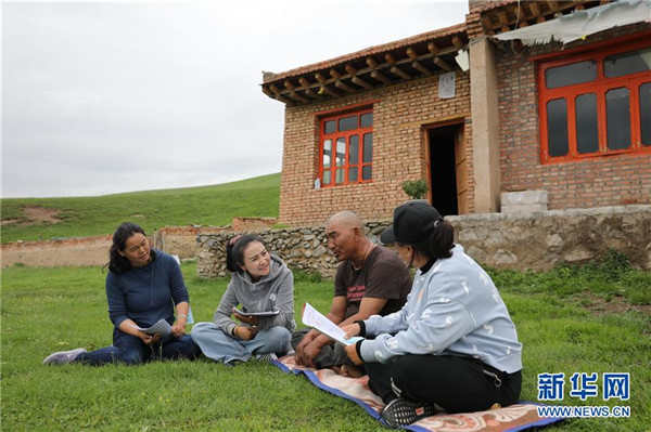 7月23日,在甘肅省甘南藏族自治州夏河縣??奇?zhèn)崗岔村,卓瑪吉(左二)和駐村幫扶工作隊(duì)隊(duì)員一起入戶了解村民巴桑一家的生產(chǎn)生活情況。崗岔村是甘肅省甘南藏族自治州夏河縣??奇?zhèn)的一個(gè)牧業(yè)村,平均海拔3000米以上。2018年,在夏河縣文明辦工作的卓瑪吉開始擔(dān)任駐村幫扶工作隊(duì)隊(duì)長,每年都有200多天待在草原上。兩年來,卓瑪吉帶領(lǐng)大家開辦扶貧車間,發(fā)展特色產(chǎn)業(yè),聯(lián)系勞務(wù)輸出。為了讓村民更全面地了解精準(zhǔn)扶貧政策,卓瑪吉登門宣講政策。為了提高村容村貌,卓瑪吉發(fā)動(dòng)大家開展廁所革命和庭院環(huán)境評(píng)比,積極響應(yīng)甘南藏族自治州“全域無垃圾”創(chuàng)建行動(dòng)。她還從縣城請(qǐng)來醫(yī)生,為村民舉辦健康講座,在全村婦女中開展“兩癌篩查”。如今,崗岔村變成了干凈、整齊、富裕、美麗的生態(tài)文明村,提前實(shí)現(xiàn)了整村脫貧。談起心愿,卓瑪吉說:“要讓草原和草原上的人都變得更美。”新華社發(fā)(杜哲宇攝)