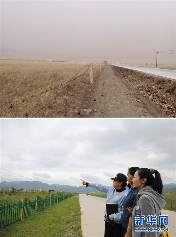 拼版照片:上圖為崗岔村村道綠化改造前的面貌(資料照片)。下圖為7月23日,卓瑪吉(右一)和駐村幫扶工作隊(duì)隊(duì)員站在綠化改造后的崗岔村村道上,謀劃下一步的工作。新華社發(fā)(杜哲宇攝)崗岔村是甘肅省甘南藏族自治州夏河縣桑科鎮(zhèn)的一個(gè)牧業(yè)村,平均海拔3000米以上。2018年,在夏河縣文明辦工作的卓瑪吉開始擔(dān)任駐村幫扶工作隊(duì)隊(duì)長,每年都有200多天待在草原上。兩年來,卓瑪吉帶領(lǐng)大家開辦扶貧車間,發(fā)展特色產(chǎn)業(yè),聯(lián)系勞務(wù)輸出。為了讓村民更全面地了解精準(zhǔn)扶貧政策,卓瑪吉登門宣講政策。為了提高村容村貌,卓瑪吉發(fā)動(dòng)大家開展廁所革命和庭院環(huán)境評(píng)比,積極響應(yīng)甘南藏族自治州“全域無垃圾”創(chuàng)建行動(dòng)。她還從縣城請(qǐng)來醫(yī)生,為村民舉辦健康講座,在全村婦女中開展“兩癌篩查”。如今,崗岔村變成了干凈、整齊、富裕、美麗的生態(tài)文明村,提前實(shí)現(xiàn)了整村脫貧。談起心愿,卓瑪吉說:“要讓草原和草原上的人都變得更美。”新華社發(fā)