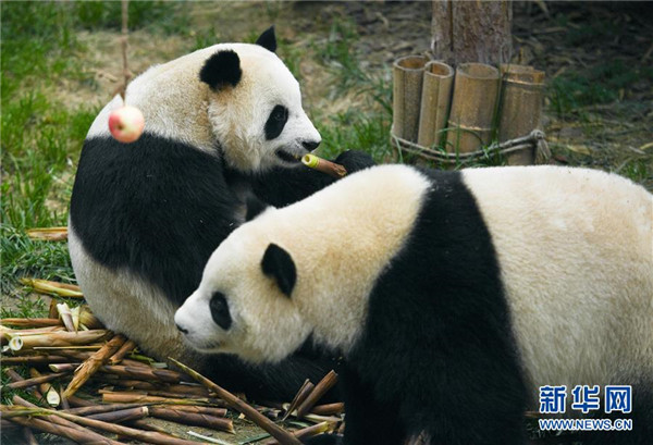 8月16日,大熊貓“奇果”(右)和“園滿”在西寧熊貓館內(nèi)玩耍。青海省西寧熊貓館的四只大熊貓已經(jīng)在西寧生活了一年多,在工作人員的悉心照顧下,已經(jīng)適應(yīng)了青藏高原的氣候,身體各項(xiàng)指標(biāo)正常。新華社記者耿輝凰攝