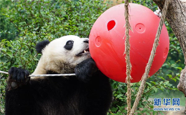 8月16日,大熊貓“園滿”在西寧熊貓館內(nèi)玩耍。青海省西寧熊貓館的四只大熊貓已經(jīng)在西寧生活了一年多,在工作人員的悉心照顧下,已經(jīng)適應(yīng)了青藏高原的氣候,身體各項(xiàng)指標(biāo)正常。新華社記者薛玉斌攝