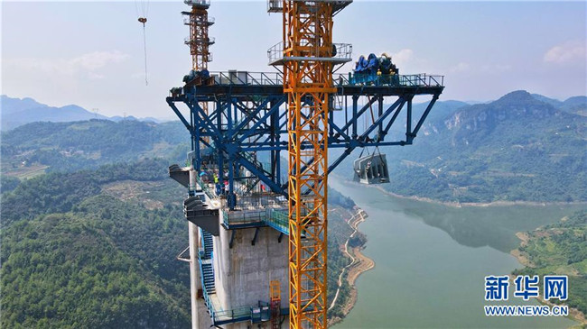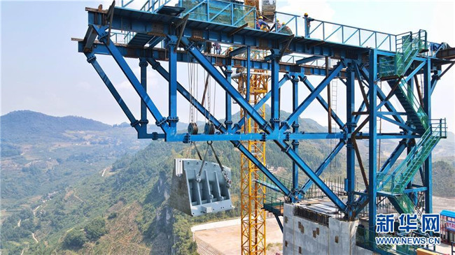 9月1日,工作人員在對主索鞍進(jìn)行吊裝(無人機照片)。新華社記者劉續(xù)攝