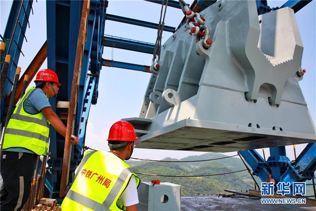 9月1日,工作人員在對主索鞍進(jìn)行吊裝。新華社記者劉續(xù)攝