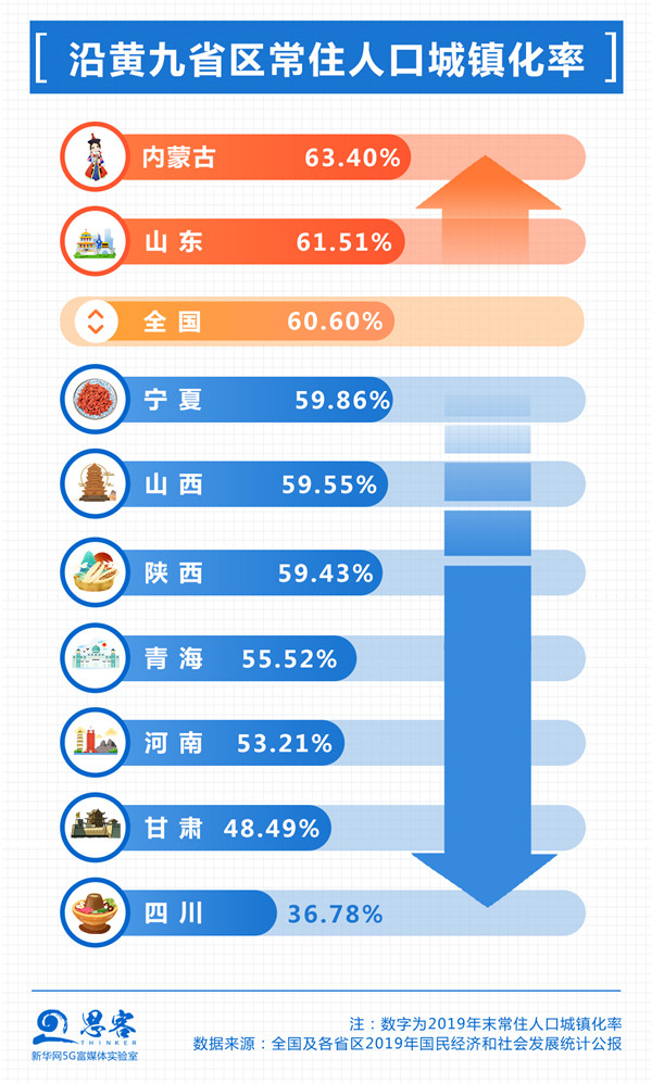 鄭州、西安、濟南等中心城市和中原等城市群帶動區(qū)域內(nèi)城市及城市群加快建設(shè),但目前九省區(qū)城鎮(zhèn)化水平及中心城市輻射帶動能力仍有待提升。沿黃九省區(qū)僅有內(nèi)蒙古和山東的常住人口城鎮(zhèn)化率高于全國平均水平。從中心城市看,流域內(nèi)鄭州和西安的地區(qū)生產(chǎn)總值在九大國家中心城市中處在相對較后的位置。西寧、蘭州、銀川等首位度相對較高的省會城市輻射帶動能力也有限。