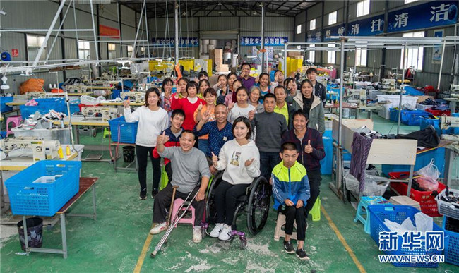 10月13日,在湖南省邵陽市城步縣湖南七七科技股份有限公司生產車間,殘疾女青年楊淑亭(前排中)與工友合影。1991年出生的苗族姑娘楊淑亭因車禍胸部以下高位截癱,通過不斷學習摸索,開辦網店并注冊了自己的企業(yè),與周邊貧困家庭簽訂合作協(xié)議,制作售賣具有民族特色的背包和仿真花卉,帶動上千名貧困人員及59名殘疾人就業(yè)。