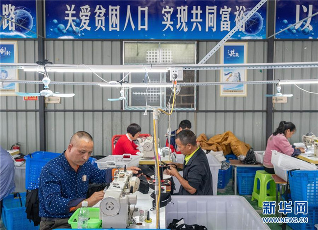 10月13日,在湖南省邵陽市城步縣殘疾人楊淑亭開辦的湖南七七科技股份有限公司生產車間里,工人們在制作民族特色背包。1991年出生的苗族姑娘楊淑亭因車禍胸部以下高位截癱,通過不斷學習摸索,開辦網店并注冊了自己的企業(yè),與周邊貧困家庭簽訂合作協(xié)議,制作售賣具有民族特色的背包和仿真花卉,帶動上千名貧困人員及59名殘疾人就業(yè)。
