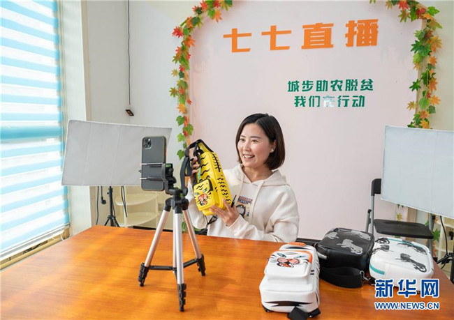 10月13日,在湖南省邵陽市城步縣湖南七七科技股份有限公司,殘疾女青年楊淑亭通過網絡銷售背包。1991年出生的苗族姑娘楊淑亭因車禍胸部以下高位截癱,通過不斷學習摸索,開辦網店并注冊了自己的企業(yè),與周邊貧困家庭簽訂合作協(xié)議,制作售賣具有民族特色的背包和仿真花卉,帶動上千名貧困人員及59名殘疾人就業(yè)。