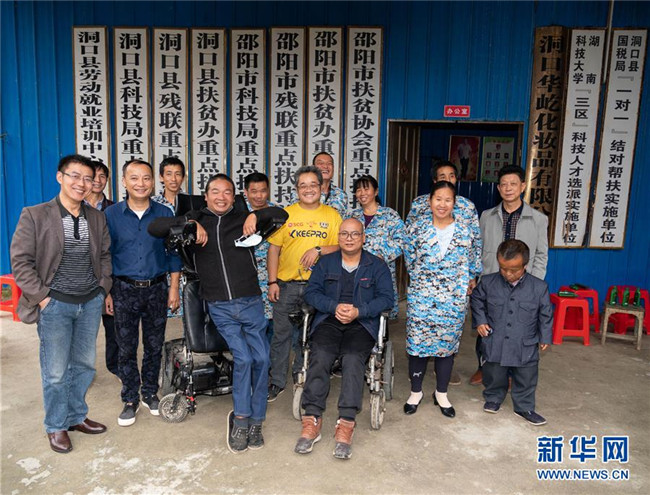 10月13日,在湖南省邵陽市洞口縣華屹化妝品有限公司,殘疾人張赫倫(左五)與他的伙伴們合影留念。42歲的張赫倫在1998年因強直性脊柱炎致一級殘疾,失去生活自理能力。他通過生產洗發(fā)水致富,主動吸納18名殘疾人就業(yè),還以“基地+農戶”模式帶動50多戶貧困戶脫貧致富。