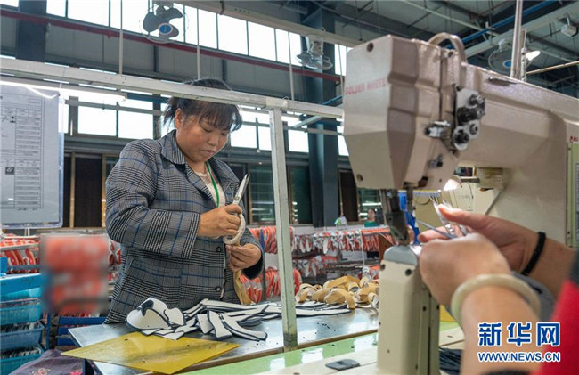 10月12日,在湖南省邵陽市聯(lián)泰鞋業(yè)有限公司,裝有假肢的殘疾人麻玉美在生產線上工作。
