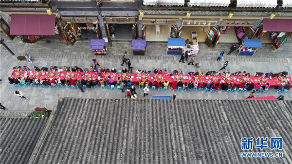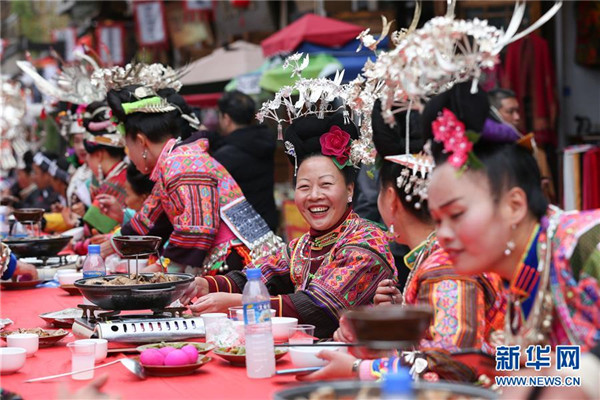 10月18日,游客在貴州省丹寨縣萬(wàn)達(dá)小鎮(zhèn)吃新節(jié)長(zhǎng)桌宴上品嘗佳肴。當(dāng)日,貴州省黔東南苗族侗族自治州丹寨縣萬(wàn)達(dá)小鎮(zhèn)舉辦苗族吃新節(jié)體驗(yàn)活動(dòng)。當(dāng)?shù)孛缱逋J笙舞、品長(zhǎng)桌宴,并邀請(qǐng)游客參與其中,大家在歡聲笑語(yǔ)中樂(lè)享金秋。新華社發(fā)(陸德華攝)