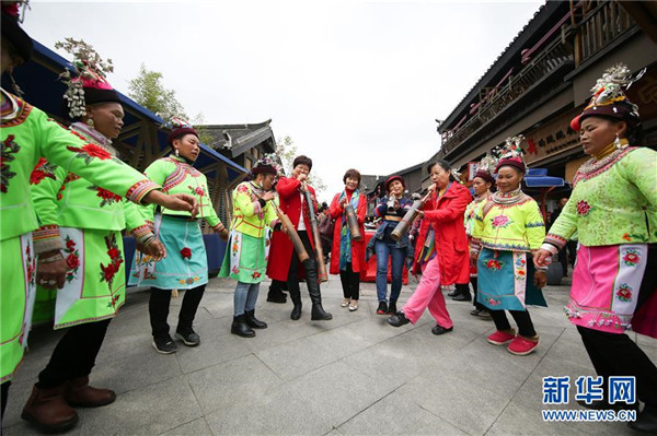 10月18日,游客在貴州省丹寨縣萬(wàn)達(dá)小鎮(zhèn)吃新節(jié)上體驗(yàn)苗族傳統(tǒng)蘆笙舞。當(dāng)日,貴州省黔東南苗族侗族自治州丹寨縣萬(wàn)達(dá)小鎮(zhèn)舉辦苗族吃新節(jié)體驗(yàn)活動(dòng)。當(dāng)?shù)孛缱逋J笙舞、品長(zhǎng)桌宴,并邀請(qǐng)游客參與其中,大家在歡聲笑語(yǔ)中樂(lè)享金秋。新華社發(fā)(黃曉海攝)