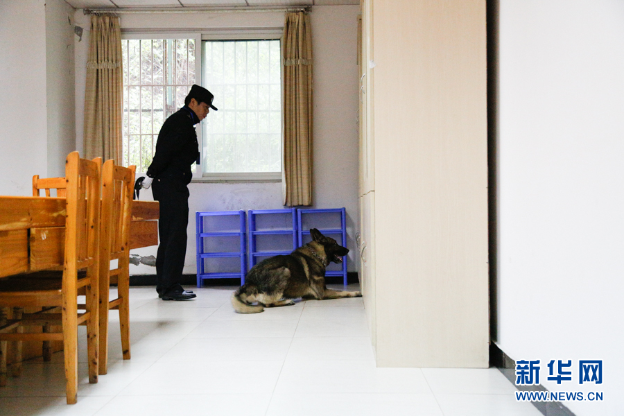 警犬正在房間內(nèi)搜索可疑物品。新華網(wǎng)發(fā)(耿駿宇 攝)