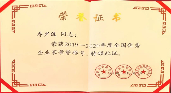 喜訊!神南產(chǎn)業(yè)發(fā)展公司董事長(zhǎng)、總經(jīng)理喬少波喜獲2019-2020年度“全國(guó)優(yōu)秀企業(yè)家”榮譽(yù)稱(chēng)號(hào)