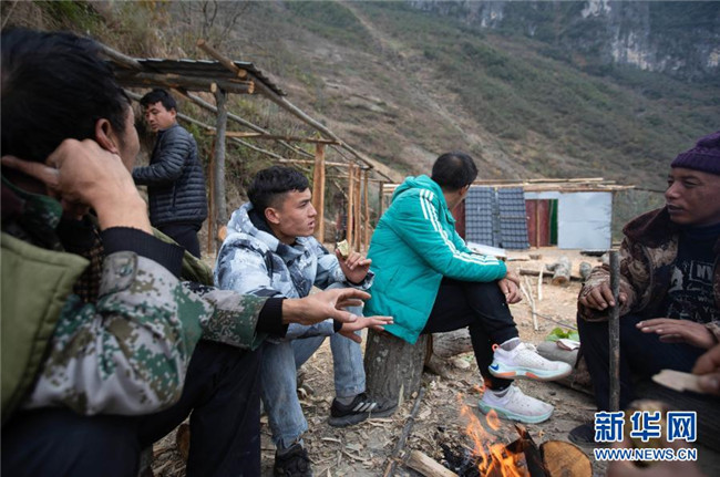 12月23日,某色蘇不惹(右三)和同伴在修民宿的地方休息吃東西。新華社記者 江宏景 攝