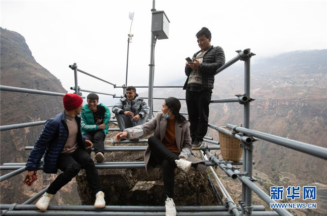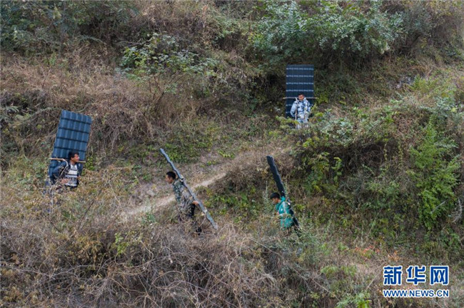 12月23日,某色蘇不惹(中)和同伴在鋼梯上休息,他們正通過(guò)鋼梯把修民宿的建材往村里背。新華社記者 江宏景 攝