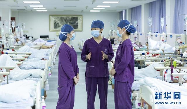 海軍軍醫(yī)大學(xué)第二附屬醫(yī)院急診、重癥醫(yī)學(xué)科護(hù)士長(zhǎng)陳靜(中)與腎內(nèi)科護(hù)士交流病人情況(8月5日攝)。新華社發(fā)(汪輝 攝)