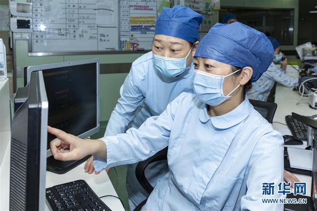 海軍軍醫(yī)大學(xué)第二附屬醫(yī)院急診、重癥醫(yī)學(xué)科護(hù)士長(zhǎng)陳靜(右)通過(guò)監(jiān)控查看病人情況(8月5日攝)。新華社發(fā)(汪輝 攝)