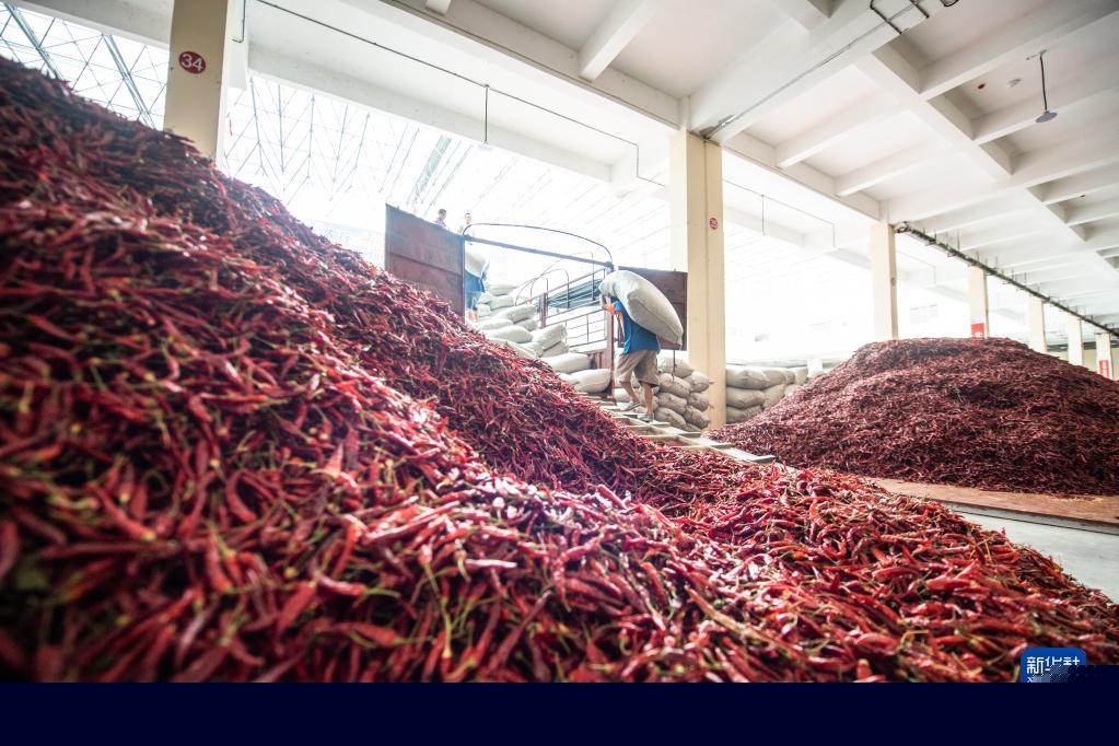 工人在遵義市新蒲新區(qū)中國(guó)辣椒城搬運(yùn)辣椒進(jìn)行裝車(2020年8月13日攝)。新華社記者 陶亮 攝